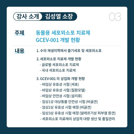 김성열(지앤지셀 기업부설연구소) 연구소장은 ‘동물용 세포외소포 치료제 GCEV-001 개발 현황’을 발표하고, 오태호(경북대 수의과대학) 교수는 ‘반려동물 임상에서의 세포치료와 엑소좀’을 소개한다.