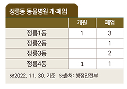 다만 정릉동의 교통편은 편리하기로 서울에서도 손꼽히는 만큼 개원지로 관심 가질 필요는 있다. 홍대, 대학로, 종로, 광화문, 신촌, 서울역, 여의도, 강남에 사는 주민들은 버스 한 번으로 정릉동에 도착할 수 있다는 점은 엄청난 지리적 강점이다. 동네 주민이 아닌 서울 전역으로 진료권을 설정한다면 정릉동도 꽤 괜찮은 개원지 후보군이 될 것이다.