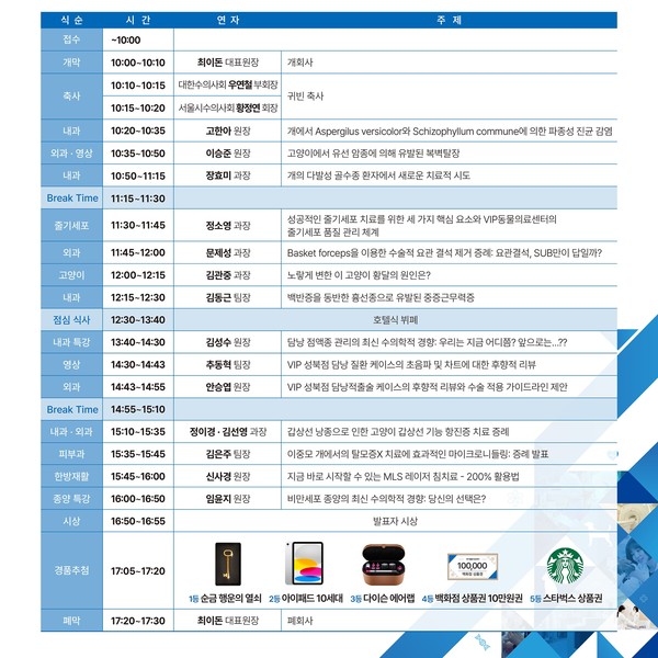 이어 정소영 과장이 ‘성공적인 줄기세포 치료를 위한 세 가지 핵심 요소와 VIP동물의료센터의 줄기세포 품질관리 체계’를, 문제성 과장이 ‘Basket forceps를 이용한 수술적 요관 결석 제거 증례’를, 김관중 과장이 ‘노랗게 변한 이 고양이 황달의 원인은?’을 설명하고, 김동근 팀장이 ‘백반증을 동반한 흉선종으로 유발된 중증근무력증’을 강의한다.