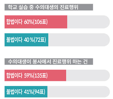 인식조사 결과와 달리 실습 또는 봉사 중 이뤄지는 수의대생의 진료행위는 지도교수의 지시나 감독이 있다면 수의사법과 그 하위법령에 따라 합법이다.