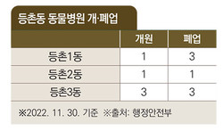 행정안전부 데이터에 따르면, 강서구 등촌동은 다른 동보다 늦은 2002년부터 동물병원이 개원하기 시작해 2022년 11월 30일까지 총 12개소가 개원, 이 중 7개소(58%)가 문을 닫고, 5개소(42%)가 개원을 유지하고 있다.