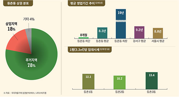 차이가 나는 이유로는 등촌동은 발산역세권과 가양역세권을 중심으로 한 대로변 상권이 강점인 만큼 1층 이외의 다른 층은 가시성과 접근성이 떨어져 임대료가 싼 것으로 풀이된다.