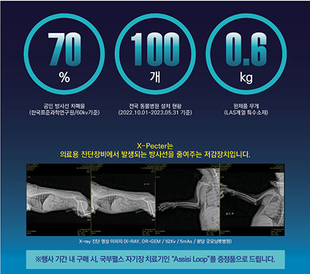 ‘X-PECTER’는 의료용 진단장비에서 발생되는 방사선을 60% 이상 줄여주는 방사선 저감 장치로 한국표준과학연구원과 서울대학교 동물병원에서 공인시험과 현장 테스트를 완료한 제품이다.