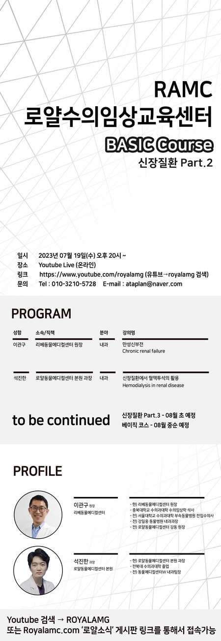 로얄동물메디컬센터가 ‘BASIC Course 신장질환 Part.2’ 세미나를 7월 19일(수) 오후 8시부터 로얄동물메디컬그룹 유튜브(youtube.com/royalamg)에서 라이브 스트리밍으로 진행한다.