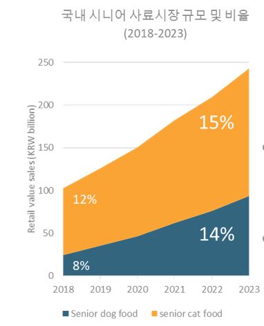 반려견, 반려묘 사료시장은 올해 약 6% 성장률을 기록했다. 반려견은 거의 정체를 보인 반면, 반려묘 사료시장이 성장을 이끌었다. 오는 2028년까지 연평균 2%대의 물가상승률을 기록할 것으로 보여 이를 감안해 강아지, 고양이 반려동물 사료 시장은 current 성장률 기준으로 연평균 6.5%씩 성장할 것으로 기대된다.