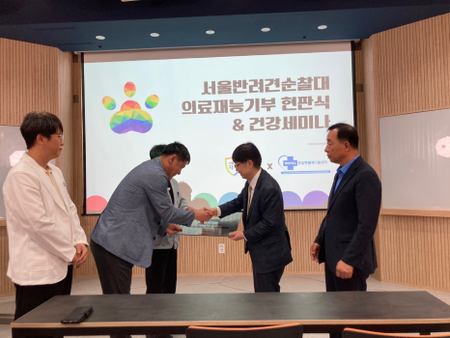 로얄동물메디컬센터 본원(대표원장 정인성)에서 지난 7월 25일 서울시 자치경찰위원회 소속 ‘서울시 반려견 순찰대’ 의료 재능기부 동물병원 현판식을 열었다.
