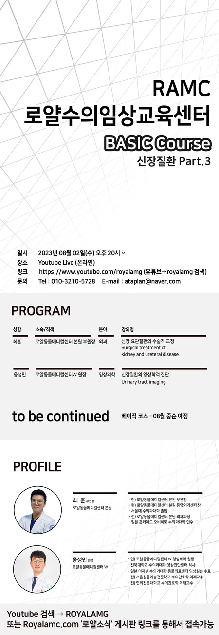 로얄동물메디컬센터가 ‘BASIC Course 신장질환 Part.3’ 웨비나를 8월 2일(수) 오후 8시부터 로얄동물메디컬그룹 유튜브(youtube.com/royalamg)에서 라이브 스트리밍으로 진행한다.