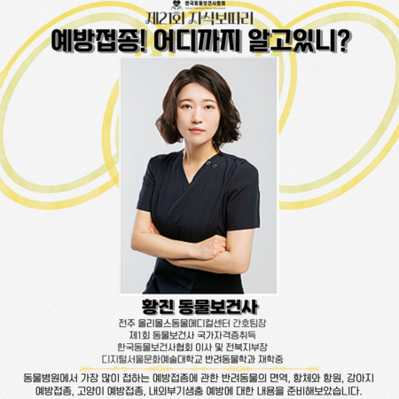 '예방접종! 어디까지 알고있니?' 웨비나는 한국동물보건사협회 전북지부장이자 전주 올리몰스동물메디컬센터에서 간호팀장으로 근무 중인 황진 동물보건사가 연자로 나선다.