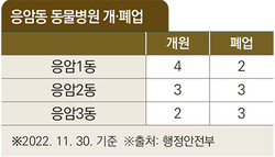 행정안전부 최신 데이터에 따르면, 은평구 응암동은 1975년부터 동물병원이 개원하기 시작해 2022년 11월 30일까지 총 17개소가 개원, 이 중 8개소(47%)가 문을 닫고, 9개소(53%)가 개원을 유지하고 있다.