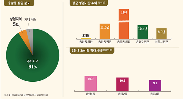 응암1동과 2동의 1평(3.3㎡)당 건물 평균 임대료는 각각 10만 9천 원대, 10만 6천 원대로 비슷한 수준을 보이지만, 응암 3동은 9만 1천원 대에 불과하다.