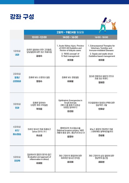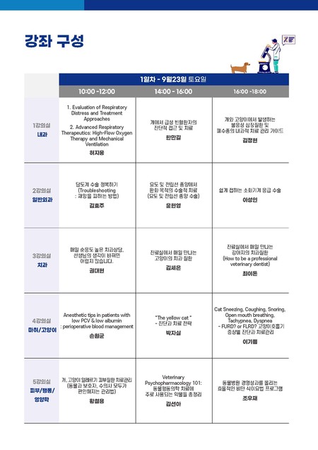 1강의실에서는 ‘내과’를 테마로 김성수(VIP동물의료센터) 원장이 ‘담낭질환에 대한 최신 치료지침’을, 허지웅 교수가 ‘급성 신장 손상’ 및 ‘면역매개질환 치료법’을 강의하고, 2강의실에서는 ‘정형·신경외과’를 테마로 정창수(정창수외과동물병원) 원장이 ‘증례로 보는 신경외과질환’을, 이해범(충남대) 교수가 ‘증례로 보는 정형질환’을, 정재민(충남대) 교수가 ‘앞다리 정형외과 질환의 진단과 최신 트렌드’를 소개한다.