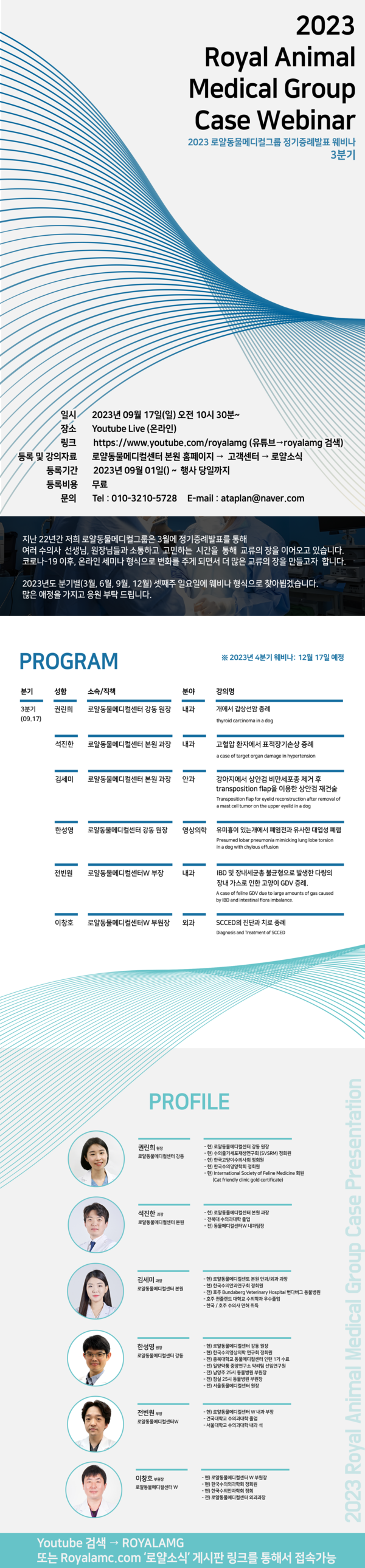 로얄동물메디컬그룹이 주최하는 ‘2023 3분기 정기 증례발표회’가 9월 17일(일) 오전 10시 30분부터 로얄동물메디컬그룹 유튜브(youtube.com/royalamg)에서 라이브 스트리밍으로 진행된다.