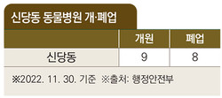 행정안전부 최신 데이터에 따르면, 중구 신당동은 1975년부터 동물병원이 개원하기 시작해 2022년 11월 30일까지 총 17개소가 개원, 이 중 8개소(47%)가 문을 닫고, 9개소(53%)가 개원을 유지하고 있다.