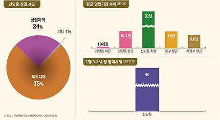 올해 1분기 기준 신당동의 1평(3.3㎡)당 건물 평균 임대료는 40만 2천 원 수준으로 꾸준히 상승하는 추세다. 신당동은 조망권에 따라 거래 가격의 차이가 심한 지역으로 지하철역에서 가까울수록 임대료가 높다.