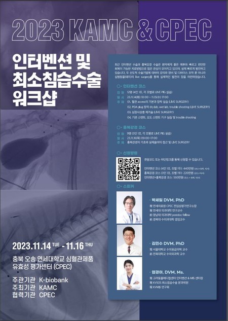 청주 고려동물메디컬센터(원장 이승근, 이하 KAMC)가 ‘인터벤션 및 최소침습수술 워크숍’을 오는 11월 14일(화)~16일(목) 3일간 충북 오송 연세대학교 심혈관제품 유효성 평가센터(CPEC)에서 개최한다.