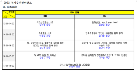 302강의실에서는 ‘정형외과 기본 다지기’ 테마로 손원균(서울대) 교수가 ‘정형외과 수술환자의 마취 및 통증관리’를, 강병재(서울대) 교수가 ‘증례로 알아보는 앞다리 관절 질환’을, 양정환(서울동물병원) 원장이 ‘증례로 살펴보는 고관절 질환 치료 옵션 넓히기’를 설명하고, 정창수(정창수외과동물병원) 원장이 ‘전십자인대 질환에서의 TPLO수술법’을, 장재영(장재영외과동물병원) 원장이 ‘나에게 가장 알맞은 슬개골탈구 수술법은?’을 주제로 강의를 진행한다.