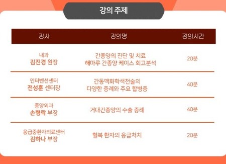 발표는 김진경(내과) 원장의 ‘간종양의 진단 및 치료: 해마루 간종양 케이스 회고분석’을 시작으로 전성훈(인터벤션센터) 센터장이 ‘간동맥화학색전술의 다양한 증례와 주요 합병증’을, 손형락(종양외과) 부장이 ‘거대간종양의 수술 증례’를, 김하나(응급중환자의료센터) 부장이 ‘혈복 환자의 응급처치’를 주제로 진행할 예정이다.