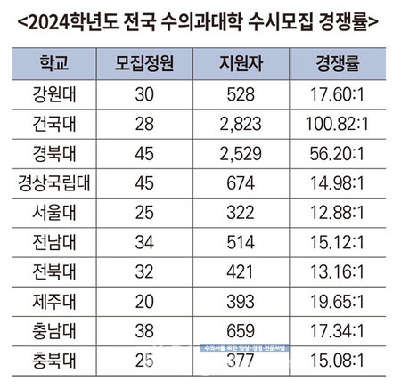 2024학년도 수시모집 원서 접수가 지난 9월 15일 마감된 가운데, 전국 10개 수의과대학의 수시 경쟁률이 28.7대 1을 기록, 322명 모집에 총 9,240명이 지원했다.