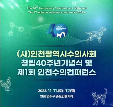(사)인천광역시수의사회(회장 박정현, 이하 인천지부)의 ‘창립 40주년 기념식’ 및 ‘제1회 인천수의컨퍼런스’가 오는 11월 11일(토)~12일(일) 양일간 송도컨벤시아에서 개최된다.