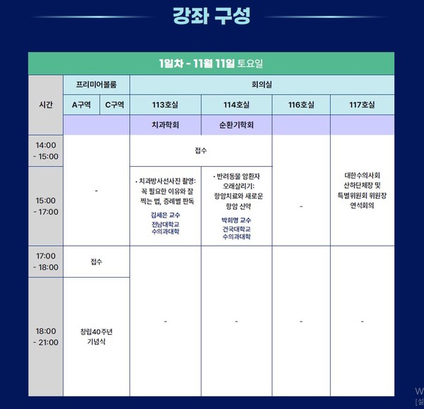 첫 날 강의는 오후 3시부터 5시까지 회의실 2개 강의실에서 진행, 113호실에서 ‘치과학회’ 강의로 김세은(전남대) 교수가 ‘치과방사선사질 촬영: 꼭 필요한 이유와 잘 찍는 법, 증례별 판독’을, 114호실에서는 ‘순환기학회’ 강의로 박희명(건국대) 교수가 ‘반려동물 암환자 오래 살리기: 항암치료와 새로운 항암 신약’을 소개할 예정이다.