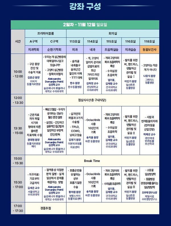 회의실 113호실에서는 ‘외과’ 강의로 한수(한수동물병원) 원장이 ‘슬개골 내측탈구 슬와근건 절단의 이해-TTT 대체’를, 김영기(더본외과동물의료센터) 원장이 ‘십자인대 파열과 3가지 수술법’을, 황야원(부평스카이동물의료센터) 원장이 ‘호흡곤란 유발하는 상부 호흡기질환 수술’을 강의할 예정이다. 114호실 ‘내과’ 강의에서는 김하정(전남대) 교수가 ‘개, 고양이 알러지 관리와 감염치료 최신 가이드라인 업데이트’를 소개하고, 송치윤(바른동물병원) 원장이 오후 1시 30분부터 5시까지 ‘Oclacitinib 사용 10년간의 기록’을 발표한다.