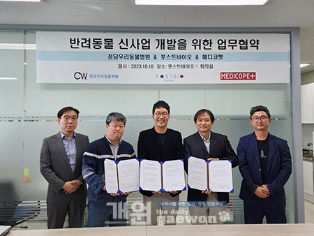 청담우리동물병원(원장 윤병국)과 포스트바이오(주)(대표 천두성), (주)메디코펫(대표 윤병국)이 반려동물 신사업 개발을 위한 양해각서를 체결했다.