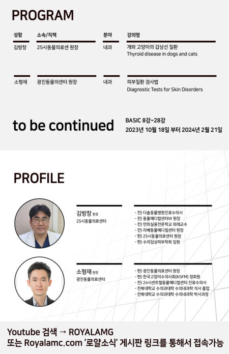 이번 강의는 총 2개로 구성, 김방창(25시동물의료센터) 원장이 ‘개와 고양이의 갑상선 질환’을, 소형재(광진동물의료센터) 원장이 ‘피부질환 검사법’을 주제로 강의를 진행할 예정이다.