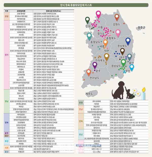 농림축산검역본부 동물보호관리시스템에 정식으로 등록된 동물장묘업체는 2023년 11월 현재 총 73곳으로 나타났다. 7년 전인 2016년 11월 총 19곳과 비교하면 7년 만에 54곳이나 늘어 4배 가까이 증가했다. 지난해 10월 총 62곳이었던 것과 비교해도 1년새 10곳이나 늘어났다. 장례식장의 분포도 전국적으로 확대되는 추세다. 2016년에는 없던 강원, 세종, 울산, 인천, 전남 지역에 동물장례식장이 생겼으며, 경기도의 경우 고양, 김포, 광주에만 있던 장례식장이 안산, 양주, 이천, 남양주, 용인, 파주, 양평군, 포천, 화성까지 확대됐다. 7년 전에 8곳이었던 경기도는 현재 26곳으로 가장 많이 증가했으며, 뒤를 이어 경남이 1곳에서 9곳으로, 경북이 1곳에서 7곳으로 늘었다. 충북은 2곳에서 5곳, 충남은 3곳에서 4곳, 부산은 1곳에서 3곳으로 늘었으며, 대구와 광주는 각각 1곳이 계속 유지 중이다. 이런 증가세는 반려인구의 증가로 반려동물 장례에 대한 수요가 높아지면서 장묘업이 반려동물산업의 한 축으로 성장하고 있는 것으로 풀이된다. 반려동물의 노령화로 인해 앞으로 동물장례식장에 대한 수요는 계속 증가할 것이며, 장묘업체 수 또한 계속 늘어날 전망이다. <편집자주>