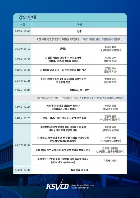 증례발표에서는 이승철(별사랑동물병원) 원장이 ‘개에서 알러젠 특이 면역치료를 통한 난치성 중이염의 성공적 관리’ 발표를 시작으로 송두원(샤인동물메디컬센터) 원장이 ‘내이염과 동반된 급성 감염성 수막척수염’을, 김지희(24시공감365동물의료센터) 내과과장이 ‘귀 연고제 사용 후 발생한 강아지 전음성 난청’을, 강동재 수의사가 ‘고양이 중이 선암종에 의한 빌라렛 증후군’에 대해 발표한다.