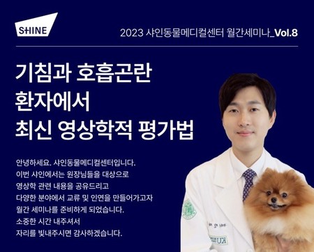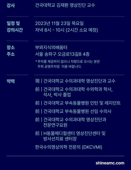 샤인동물메디컬센터가 11월 ‘월간 세미나’를 11월 23일(목) 오후 8시부터 10시까지 송파구에 위치한 부와지식의배움터에서 개최한다.