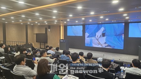 실습에 참여하지 않은 20명도 강의실에서 실시간으로 전송되는 핸드캠과 내시경 카메라 화면 영상으로 실습실 내 강의를 볼 수 있게 해 강의실에서도 현장감 있는 실습교육이 가능했다. 또 강의실 참석자들도 마이크와 화면을 통해 실시간으로 질문하고 대답을 들을 수 있어 큰 호응을 얻었다.