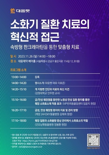 대웅펫 관계자는 “이번 심포지엄은 급성 및 만성 췌장염 질환으로부터 반려동물의 삶의 질 개선을 위해 마련된 행사로 수의사 및 업계 전문가들이 췌장 질환의 진단과 치료에 대한 논의를 진행하고, 췌장질환에 췌장 소화효소제가 미치는 영향에 대한 지견을 공유할 예정이니 많은 관심과 참여 바란다”고 말했다.
