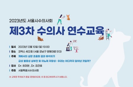 서울시수의사회(회장 황정연, 이하 서수회)가 ‘2023 제3차 연수교육’을 오는 12월 10일(일) 오전 10시부터 오후 4시 15분까지 코엑스 402호에서 개최한다.