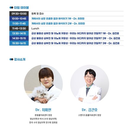 이번 연수교육은 최미현(본동물의료센터) 원장이 ‘개에서의 심장 초음파 결과 해석하기’를, 김건호(스탠다드동물의료센터) 원장이 ‘급성 불응성 심부전 및 이뇨제 저항성: 우리는 어디까지 알아낸 것일까?’를 각각 오전과 오후에 진행한다.