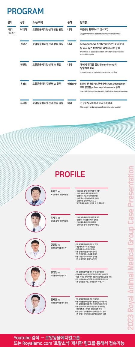 이번 증례발표회는 이재희·김세훈(로얄동물메디컬센터 본원) 원장과 김태건(로얄동물메디컬센터 강동) 원장, 한만길·옹성민(로얄동물메디컬센터 W) 원장 총 5명의 의료진이 연자로 나선다.