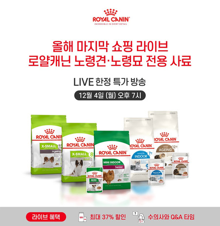 로얄캐닌 측에 따르면, 이날 라이브 방송을 통해 노령기 반려동물을 위한 맞춤영양 사료를 라이브한정 프로모션으로 선보인다. 방송 중 구매한 고객에게는 최대 37% 할인 혜택과 함께 노령기 전용 습식 파우치 샘플이 제공되며, 구매 옵션에 따라 푹신한 방석이 내장된 반려동물 이동가방을 추가 증정한다.