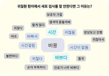 귀질환 환자에게 세포 검사를 잘 하지 않는 이유로는 ‘검사하는 시간 및 노력에 비해 제대로 된 비용을 받지 못해서’ 응답이 1위로 꼽혔으며, 검이경 검사 역시 비슷한 답변이 나왔다.