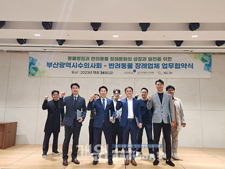 부산지부는 “수의사의 권익 신장과 반려동물 복지증진을 위하고, 사람과 동물의 행복한 공존을 위해 장례문화를 선도하는 장례업체 펫로스케어 및 스타티스와 업무협약을 체결했다”며 “반려동물들이 무지개다리 건널 때 보호자들의 아픈 마음을 치유하고, 펫로스 증후군을 전문 상담할 수 있도록 양사와 협력하기로 했다”고 밝혔다.