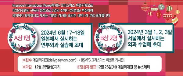 접수는 12월 25일(일)까지 본지 데일리개원(dailygaewon.com) ‘ISVPS 크리스마스 이벤트 게시판’에서, 당첨자는 12월 26일(화) 데일리개원 홈페이지 및 뉴스레터를 통해 발표할 예정이다.