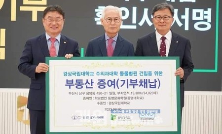 이에 경상국립대 수의대 동물병원의 부산 동명대 캠퍼스 내 건립 사업이 지난해 6월 ‘2024년 교육부 민간투자사업 심의’에서 승인받으며 동명대는 남구 용당동 490-21 일원에 달하는 대학 부지 약 1만 3,300㎡를 경상국립대에 무상 기부채납했다.
