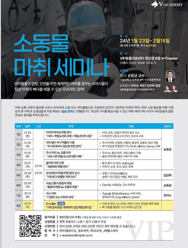 보조강사로는 VIP동물의료센터 마취통증의학과의 차지수 과장과 김민하 팀장이 참여한다.