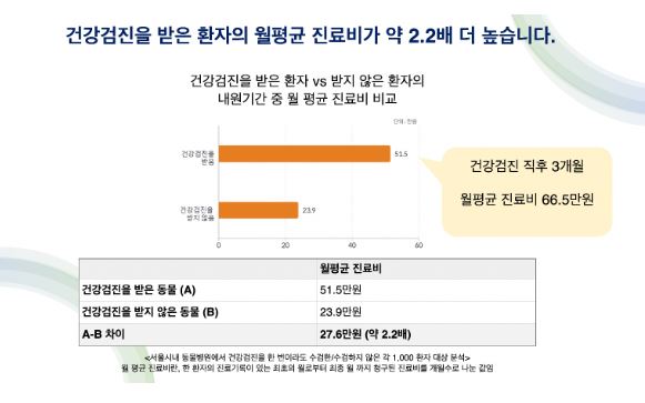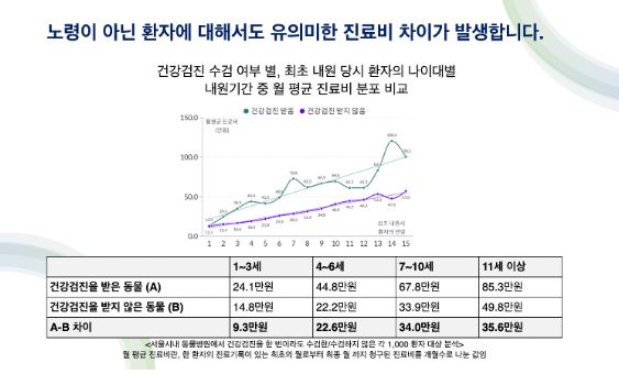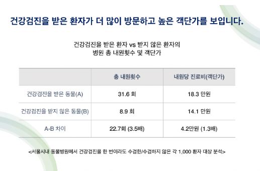 건강검진을 받은 환자의 총 내원 횟수는 그렇지 않은 환자보다 3.5배 많았으며, 내원당 객단가 역시 30% 이상 높게 나타났다. 또한 건강검진을 받은 1세부터 3세까지 환자의 평균 진료비가 9.3만 원이나 더 높게 나타나면서 건강검진은 노령 환자에게만 경영적 효과가 있다는 인식과 달리 어린 환자에 대해서도 유의미한 진료비 차이를 발생시켰다.
