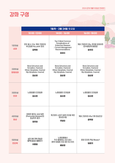 ‘내과’ 강의는 BECZKOWSKY Pawel Marek 수의사가 ‘개/고양이 신부전 최신 업데이트’를, 김건호(스탠다드동물의료센터) 원장이 ‘고양이 CKD’에 대한 최신 지견을 전달하고, 김예원(더케어동물의료센터) 원장이 ‘ECG 기초부터 응급까지’를 주제로 강의를 진행한다.