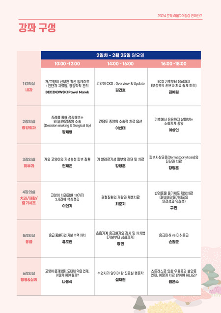 첫째 날인 24일(토)에는 미국수의외과학전문의 강의와 안과 강의를 비롯해 다양한 임상 강의가 예정돼 있다.