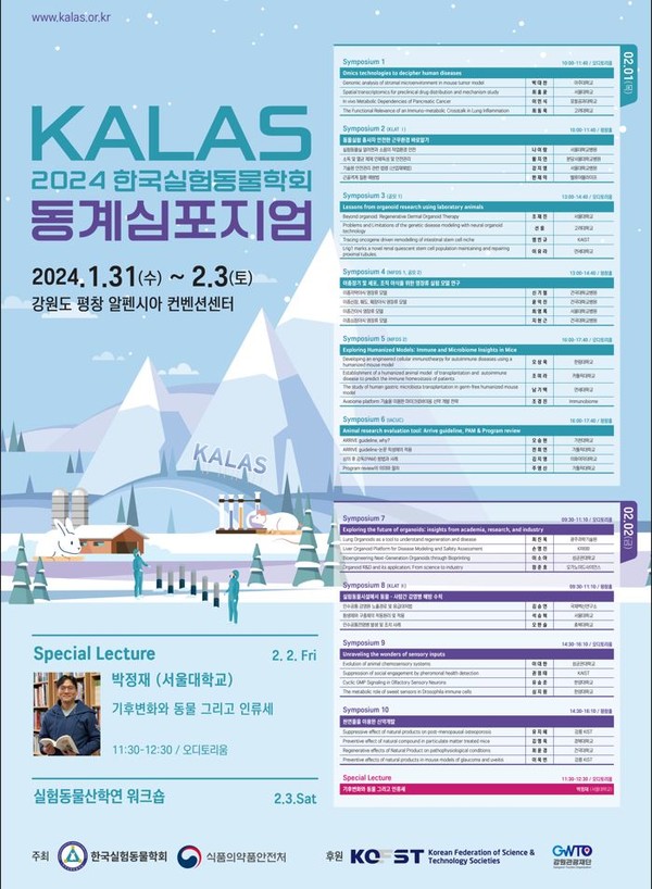 한국실험동물학회(이사장 성제경, 이하 KALAS)가 ‘2024 동계 심포지엄’을 오는 1월 31일(수)부터 2월 3일(토)까지 강원도 평창 알펜시아 컨벤션센터에서 개최한다.
