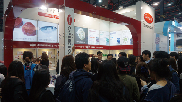 케어사이드는 영양제인 ‘오메가-덤’을 비롯해 심장보조제 ‘헤파카디오-Q10’와 ‘콘드로프로텍-T’ 등의 대표 제품을 전시해 참가자들로부터 많은 호응을 받았다.