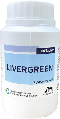 ‘리버그린’의 포장단위는 500정이며, 용법 및 용량은 10kg 미만 반려동물의 경우 초기 1정, 유지량 1/2정, 10kg 이상 반려동물의 경우는 초기 2정, 유지랑 1정이다.