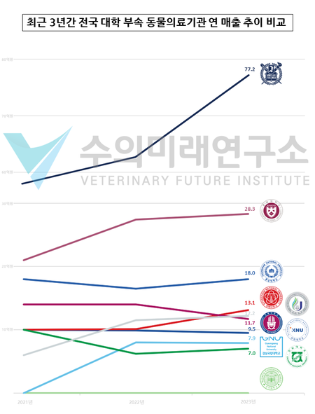 또한 연 매출 추이를 비교한 결과, 서울대 동물병원은 2022년도 약 62.7억 원에서 2023년도 약 77.2억 원으로 23%의 매출 상승을 기록했으며, 지난해를 기준으로 충북대 동물병원이 약 28.3억 원, 충남대 동물병원이 약 18억 원으로 그 뒤를 이었다.