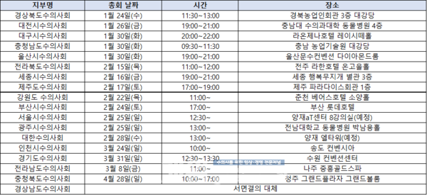 현재까지 정기총회를 마친 지부는 경북지부를 비롯해 대전·대구·울산시수의사회, 충청남도수의사회 총 5곳이며, 경상남도수의사회의 정기총회는 서면결의로 대체된다. 이밖에 대한수의사회는 2월 28일(수), 서울시수의사회는 2월 24일(일), 경기도수의사회는 3월 31일(일) 정기총회를 개최한다. 전국 시도지부의 정기총회 4월 28일(일) 충청북도수의사회를 끝으로 모두 마무리될 예정이다.