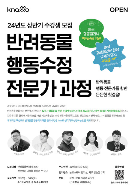 놀로 행동클리닉이 3월 9일(토)부터 5월 25일(토)까지 매주 토요일 오전 9시부터 4시간씩 총 12주간 놀로 스퀘어 6층 강의실 및 외부 실습장에서 진행하는 ‘2024 상반기 반려동물 행동수정 전문가 과정’ 수강생을 모집한다.